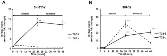 In our experimental conditions, the exposure to hypoxia for 24 h induced a significant increase (13.5-folds, p < 0.01) of TG2-S mRNA levels in SH-SY5Y cells, that was maintained even after reoxygenation (12.1-folds, p<0.01) in comparison with unexposed cells. In the same cell line, no significant changes were observed in TG2-L transcripts following hypoxia (Figure 3A). In IMR-32 cells both isoforms of TG2 were significantly increased in hypoxic condition. In particular, the TG2-S increased after hypoxia and reoxygenation by 16.3-folds and 20.8-folds (p < 0.001), respectively. Similarly, the expression of TG2-L significantly increased after 24 h of hypoxia by 31-folds, and although decreased at the end of reoxygenation, remained about 7-fold higher than in unexposed cells (Figure 3B).