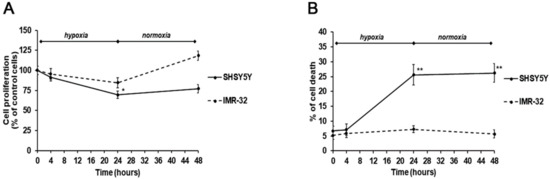 Cell proliferation (A) and cell death (B) assessed by MTT ((3-(4,5-methylthiazol-2-yl)-2,5-diphenyl-tetrazolium bromide)) and trypan blue exclusion assays in SH-SY5Y and IMR-32 NB cells unexposed and exposed to hypoxic conditions (1% O2) up to 24 h followed by reoxygenation for further 24 h. Results are expressed as percentages of the values detected in control cells. Each value is the mean ± SEM. *p < 0.05 and **p < 0.01 significant differences in comparison to unexposed cells.