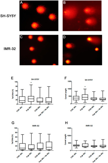 In IMR-32 cells we did not found differences in DNA damage parameters after hypoxia (Figure 5C,D), no changes in tail DNA percentage and comet length were evidenced in hypoxia exposed cells in comparison to unexposed cells (Figure 5G,H).