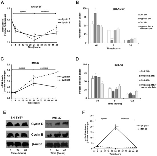 In comparison to SH-SY5Y, in IMR-32 cells the hypoxia conditions induced different effects on cell cycle markers. After exposure to hypoxia for 24 h, there was a significant increase of cyclin D1 expression (p < 0.05) that decreased in reoxygenated cells. In hypoxic cells we also observed a considerable increase of cyclin B1 expression that after reoxygenation increased by about 4.5-folds in comparison to cells grown in normal O2 conditions (Figure 6C,E). In IMR-32 no significant changes were observed in the mRNA levels of p16 both after hypoxia and reoxygenation incubations (Figure 6F). The cell cycle analysis did not show relevant changes in the number of cells in the different phases (Figure 6D). The up-regulation of cyclin D1 and B1 expression observed in IMR-32 could be responsible of the slight increase of cell proliferation.