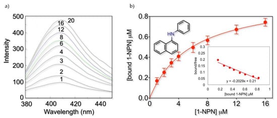 The rFel d 1 binds the fluorescent probe 1-NPN, producing a blueshift in the emission spectrum. Similarly to odorant-binding proteins (OBPs) and chemosensory proteins (CSPs) [], the emission maximum occurs at 407 nm and is accompanied by a strong increase in fluorescence intensity. Figure 1 reports the actual emission spectra obtained with a rFel d 1 concentration of 1 µM and the relative binding curve obtained after processing the data with the GraphPad Software, Inc., giving a dissociation constant of 5.8 µM. Scatchard analysis confirmed the presence of a single binding site on the protein without any cooperativity effect and yielded a dissociation constant K1-NPN value of 4.8 µM. We also tested other fluorescent probes (2-NPN, 1-AMA (1-aminoanthracene), 1,8-ANS (8-anilinonaphtalene sulfonic acid), but none proved to perform better than 1-NPN (data not shown).