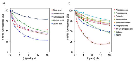 Competitive binding of selected fatty acids (a) and steroids (b) to rFel d 1. Fluorescence emission spectra were recorded at 25 °C in the presence of 1 µM of rFel d 1 and 2 μM of 1-NPN; excitation and emission wavelengths were 337 and 407 nm, respectively. Fluorescence of probe-protein complexes in the absence of a competitor was normalized to 100%.
