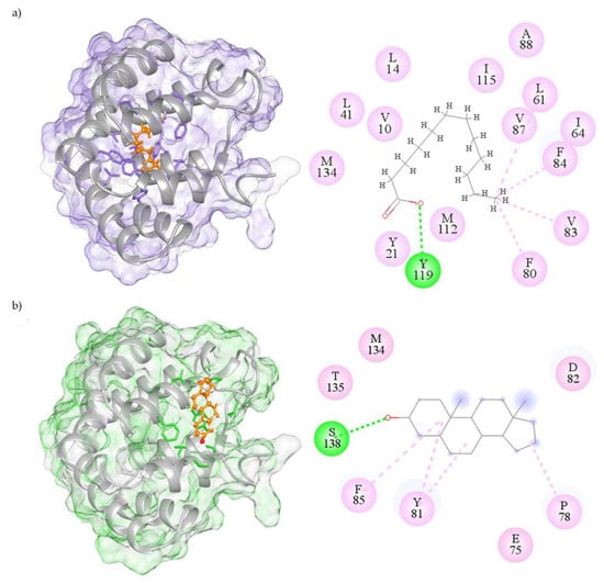 Molecular residue interactions of Fel d 1 with the best ligands, lauric acid (a) and androstenone (b). The interactions are shown in molecular ligand binding view (surface mesh) with a 2D-interaction map of the selective best-fitting ligands to the central and surface binding cavities of Fel d 1. The 2D map reports H-bond interactions in green color and hydrophobic interactions (van der Waals and alkyl/pi-alkyl) in pink color. All the amino acid residue interactions within 4 Å from the ligand are shown.