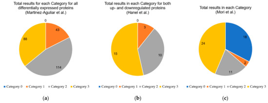 Distribution of the different categories for all proteins analysed by the OmixLitMiner tool. (a) The results of Martinez-Aguilar et al. [9]; (b) the results of Hanel et al. [10]; (c) the results of Mori et al. [11]. Category 1: review articles found; Category 2: original papers found, but no reviews; Category 3: no articles found; Category 0: protein absent in reviewed UniProt database (see Section 4.2 for details).