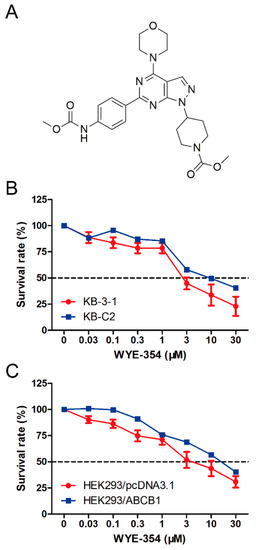 Chemical structure and survival rate of cells treated with WYE-354. (A) Chemical structure of WYE-354. (B) Cell survival–drug concentration curves for the drug-selected multidrug-resistant (MDR) cells. (C) ABCB1-transfented HEK293 cells. The survival rate was obtained from a formula: . The dotted line represents 50% survival.