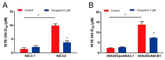 Verapamil sensitized ABCB1-overexpressing cells to WYE-354. WYE-354 co-treated with verapamil (5 μM) decreased the survival rate of WYE-354 in (A) KB-C2 cells and (B) HEK293/ABCB1 cells. All of the experiments were performed at least three times independently. Data are shown as mean ± standard deviation (SD). * represents p < 0.05, compared with the control group.