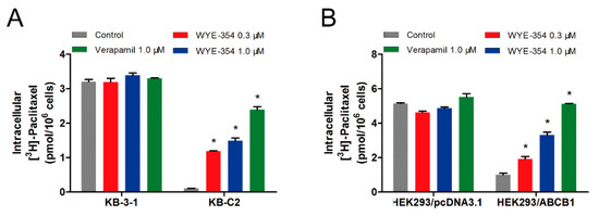 To further evaluate the mechanism of action of WYE-354, an [3H]-paclitaxel accumulation assay was performed to examine the drug–drug interaction between WYE-354 and paclitaxel, which is a known substrate of ABCB1. As shown in Figure 4, 1 µM of WYE-354 significantly increased the intracellular accumulation of the [3H]-paclitaxel in the KB-C2 cells without affecting that in the parental KB-3-1 cells. WYE-354 showed a similar effect in the ABCB1-transfected HEK293 and in its corresponding sensitive cell line. Verapamil served as a benchmark ABCB1 inhibitor. These results indicated that WYE-354 could interact competitively with other substrates at the ABCB1 transporter binding domain, which resulted in an increased accumulation of [3H]-paclitaxel.