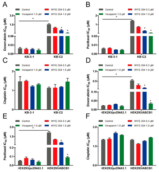 Doxorubicin and paclitaxel co-treated with WYE-354 decreased the survival rates of ABCB1-medited MDR cell lines. IC50 values of (A,D) doxorubicin, (B,E) paclitaxel and (C,F) cisplatin in drug-selected and ABCB1-transfected cell lines, respectively. Data were independently obtained from three experiments, shown as mean ± SD. * indicates p < 0.05 vs control.