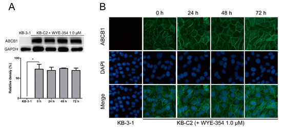 Expression level and subcellular localization of ABCB1 after up to 72 h of treatment with WYE-354. (A) Western blotting on the expression level of ABCB1 in the KB-C2 cells incubated with 1.0 µM WYE-354. Image J was used to quantify the relative density of each band. * p < 0.05, compared with the control group. (B) Immunofluorescence on the subcellular localization of ABCB1 in the KB-C2 cells treated with 1.0 µM WYE-354. Green—ABCB1. Blue—4′,6-diamidino-2-phenylindole (DAPI) counterstains the nuclei.