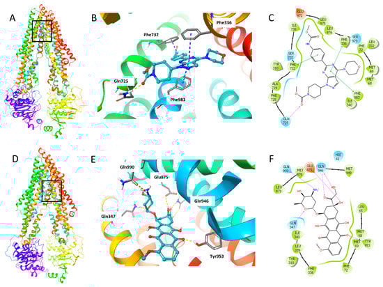 The docking simulation of WYE-354 with human ABCB1 (PDB 6QEX). (A) WYE-354 at the binding site of ABCB1 (indicated with a square). (B) WYE-354 in ball and stick mode within the binding site of human ABCB1. The atoms were colored as follows: carbon—cyan; nitrogen—blue; oxygen—red; hydrogen—white. The interactions were indicated as follows: π–π stacking—cyan dotted short line; hydrogen bonds—yellow dotted line. (C) The two-dimensional diagram of WYE-354 interacting with ABCB1. The amino acids within 3 Å are shown as colored bubbles, cyan indicates polar residues, and green indicates hydrophobic residues. The interactions are indicated as follows: π–π stacking—green short line; hydrogen bonds—purple arrow. (D) Doxorubicin at the binding site of ABCB1 (indicated with a square). (E) Doxorubicin in ball and stick mode within the binding site of human ABCB1. (F) The interaction of doxorubicin and ABCB1 in the two-dimensional diagram.
