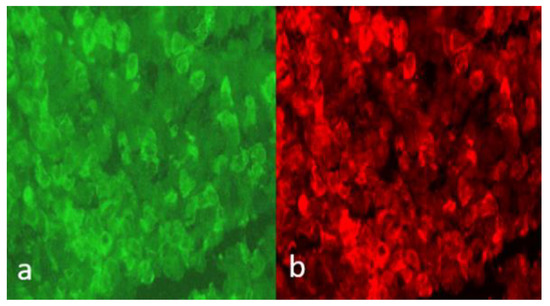 Immunofluorescence in cryostat sections of young baboon anterior pituitary gland tested against the serum of a patient with isolated growth hormone deficiency GHD, in a primary step adding FITC goat sera anti-human immunoglobulins (left panel: (a) = simple immunofluorescence) and in a second immunostaining step adding rabbit antisera anti-GH followed by rhodamine goat sera anti rabbit IgG (right panel: (b) = double four-layer immunofluorescence). The overlapping color in the same cells, green in left panel and red in right panel, indicates that the cells immunostained by APA are the somatotrophs [18]. Scale bars = 40×.