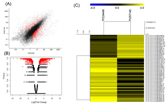 (A) Summary plot of expression values for the genotypes PI 257145 and PI 224448. The red points represent the genes with significant p-value of ≥ 0.9. (B) Volcano plot showing the Log2 fold change (FC) of differentially expressed genes (DEGs) in PI 257145 versus PI 224448. The Log2FC is plotted on the x-axis and the p-value is plotted on the y-axis. The red points in the scatter-plot show the DEGs with p-value ≥ 0.9 and the black points are less significant with p-value > 0.9. (C) Top 50 differentially expressed genes between the genotypes PI 224448 and PI 257145 based on the fragments per kilobase of transcripts per million (FPKM) normalized Log10-transformed counts. The color key yellow represents high expression and blue represents low expression.