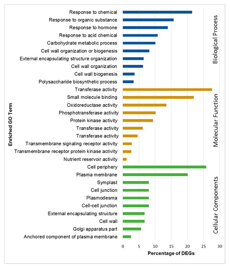 DEGs were annotated by using the BLASTx algorithm and nonredundant protein database at NCBI. Gene annotation and gene ontology (GO) enrichment analysis was performed with BLAST2GO (https://www.blast2go.com/). The DEGs were classified under the three major GO terms such as biological process, molecular function and cellular components. GO classification showed significant functions of the identified DEGs in PI 257145 versus PI 224448. A total of 1071 upregulated genes in PI 257145 were classified under top ten categories of biological process. The significant categories upregulated in PI 257145 included “cell wall biogenesis”, “polysaccharide biosynthetic process”, “carbohydrate metabolic process”, “cell wall biogenesis”, “cell wall organization”, “response to hormone” and “external encapsulating structure organization”. These categories are important for the structural stability of the fruits. The molecular function category included 941 DEGs with enriched terms of “oxidoreductase activity”, “transferase activity” and “transmembrane receptor protein kinase activity”. All these enriched molecular functions are important for fruit quality and plant defense. The major cellular components enriched in DEGs upregulated in PI 257145 included “cell periphery”, “plasma membrane”, “cell wall”, “cell–cell junction”, “plasmodesma” and “external encapsulating structure”. All these cellular component terms enriched in DEGs upregulated in high-cutin PI 257145 are essentially involved in maintenance of cellular structure and fruit quality. The statistically enriched GO terms (false discovery rate (FDR) < 0.05) among the DEGs upregulated in PI 257145 versus PI 224448 are shown in Figure 2.