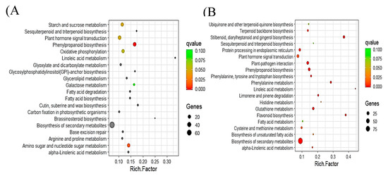Top 20 enriched KEGG pathways among upregulated (A) and downregulated (B) DEGs in PI 257145 versus PI 224448. Rich factor is the ratio of the number of DEGs to the total gene number in a pathway. Here, q-value is a corrected p-value. The color and size of the dots represent the range of q-value and the number of DEGs mapped to the indicated pathways, respectively.