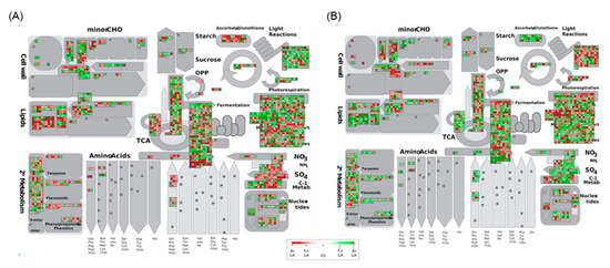 MapMan pathway analysis shows the differences in activity of different cellular metabolisms between the genotypes (A) PI 257145 and (B) PI 224448.