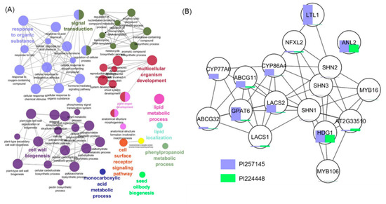 (A) Functional network analysis of upregulated genes in PI 257145 showing the functionally grouped terms with nodes linked based on their kappa score level (≥ 0.3), where only the label of the most significant term per group is shown. The node size represents the enrichment significance of the term. (B) Network analysis of genes involved in cutin biosynthesis in Capsicum chinense. Bar chart associated with the nodes shows the expression value fragments per kilobase of transcripts per million (FPKM) between PI 257145 and PI 224448.