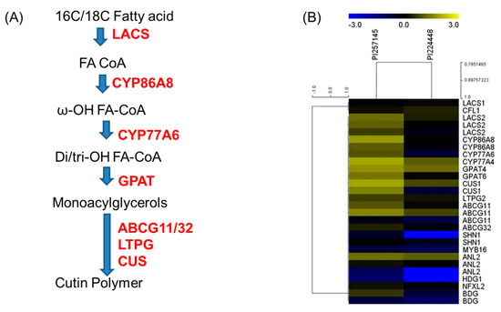 (A) Putative cutin biosynthetic pathway predicted in Capsicum chinense based on RNA-Seq data. (B) Expression of genes involved in cutin biosynthesis, transport, and regulation between the two genotypes PI 224448 and PI 257145 based on FPKM-normalized Log10-transformed counts. The color yellow represents high expression and blue represents low expression.