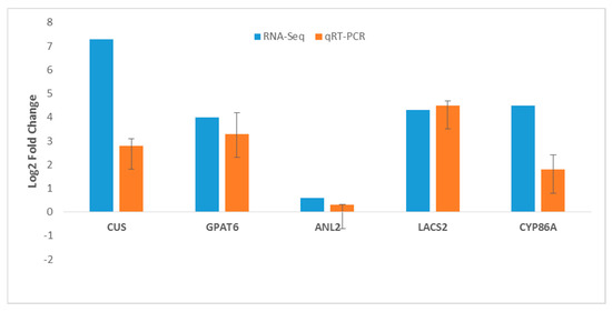 To validate the RNA-Seq data, randomly selected genes involved in the cutin biosynthetic pathway with significant expression difference between PI 257145 and PI 222448 were chosen for RT-qPCR. The selected genes were GDSL esterase/lipase (CUS), glycerol-3-phosphate 2-O-acyltransferase 6 (GPAT6), long chain acyl-CoA synthetase 2 (LACS2), HD-ZIP IV transcription factor (ANL2) and cytochrome P450 86A (CYP86A4). All the five genes were significantly upregulated in high-cutin PI 257145 versus low-cutin PI 224448. The overall results from RT-qPCR were consistent with RNA-Seq data (Figure 8).