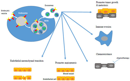 Exosomes that are secreted by CRC cell lines in vitro or by tissues in vivo have several functions in cancer elicited by its content. They can promote tumor growth [64,65,66], immune evasion [67,68], angiogenesis [69,70,71], metastasis [69,72,73,74,75,76], chemoresistance [76,77,78,79], and inducing endothelial-mesenchymal transition (EMT) in recipient cells [73,74,80,81] (Figure 1).
