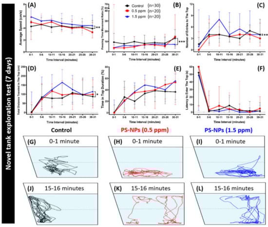 Novel tank behavior endpoints comparisons between control and polystyrene nanoplastics (PS-NPs)-exposed zebrafish groups after a ~7-day exposure. (A) Average speed, (B) freezing time movement ratio, (C) number of entries to the top, (D) total distance traveled in the top, (E) time in top duration, and (F) latency to enter the top were analyzed. The 1 min. locomotion trajectories for the control, 0.5 and 1.5 ppm PS-NPs exposed fish in the novel tank test were presented in (G to L), respectively. The black line represents the control group, the red line represents the low concentration PS-NPs group (0.5 ppm), and the blue line represents the high concentration PS-NPs group (1.5 ppm). The data are expressed as the median with interquartile range and were analyzed by a Kruskal–Wallis test, which continued with Dunn’s multiple comparisons test as a follow-up test (n = 30 for control; n = 20 for each PS-NPs-exposed group; * p < 0.05, ** p < 0.01, *** p < 0.001).