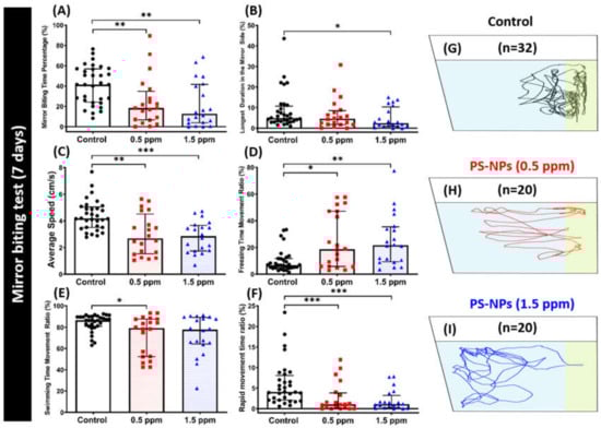 A mirror biting test was conducted to determine the aggressive nature of zebrafish altered by the exposure of PS-NPs. The mirror biting assay is a simple and efficient method to test fish aggressiveness in terms of the frequency of the tested fish to bite their mirror images [26]. This test might also indicate a more general measure of social motivation or the intent to interact with a social partner [27]. In this test, chronic exposure of PS-NPs in both concentrations significantly reduced zebrafish aggressiveness. This phenomenon is shown by a decrease in the mirror biting time percentage and in the longest duration in the mirror side (Figure 3A,B). Interestingly, both concentrations of PS-NPs exposure reduced their locomotion behavior, as indicated by a decrease in the average speed, swimming time movement ratio, and rapid movement ratio, and an increase in the freezing time movement ratio as compared to the control group (Figure 3C–F). This result suggests that both 0.5 and 1.5 ppm of PS-NPs exposure reduce the aggressiveness in zebrafish. Figure 3G–I and Supplementary Video S2 display the locomotion trajectories and behavioral changes for the control, 0.5 and 1.5 ppm PS-NPs-exposed fish in the mirror biting test.