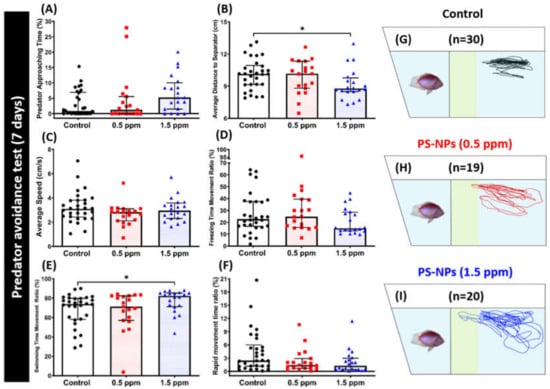 Fear is a collection of behavioral responses that are elicited by negative stimuli that are associated with imminent danger, such as the presence of a predator. Predator avoidance is an innate response for fish when facing their natural predator by showing high anxiety or even freezing behavior. Zebrafish have an innate response as freezing or anxiety when exposed to the sight of a natural predator. Therefore, this response is helpful in examining certain behavior alterations during the course of revelation to the predator [28]. In the predator avoidance test, we assessed zebrafish fear reactions, including predator avoidance behavior. We exposed the different groups of zebrafish to the predator fish convict cichlid (Amatitlania nigrofasciata). From the results, we found that exposure of PS-NPs at 0.5 ppm did not alter zebrafish fear response to the predator, as shown in Figure 4. No significant difference was detected in all of the endpoints measured during the test between control and 0.5 ppm PS-NPs-exposed fish group (Figure 4A–H). However, exposure of PS-NPs at a higher concentration (1.5 ppm) did alter their fear response to the convict cichlid. This difference was indicated by the low level of the average distance to separator between zebrafish and predator fish exhibited by high concentration PS-NPs-exposed fish (Figure 4B). In addition, there was also a slight increment in their predator approaching time, even though it did not reach a statistically significant difference (Figure 4A). Furthermore, we found a difference in 1.5 ppm PS-NPs-exposed fish movement types with the control fish, even though there was no significant difference in the average speed (Figure 4C). This difference was indicated by a high level of swimming time movement ratio, while there were no significant differences in their freezing and rapid movement time ratios (Figure 4D–F). These results suggest that 1.5 ppm of PS-NPs exposure reduces the predator avoidance behavior performance in zebrafish. In addition, Figure 4G–I and Supplementary Video S3 illustrate the locomotion trajectories and behavioral changes for the control, 0.5 and 1.5 ppm PS-NPs-exposed fish in the predator avoidance test.