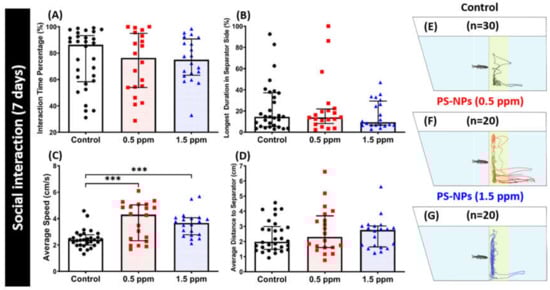 We assessed zebrafish social nature by conspecific interactions by performing social interaction tests. We tested their social interest to another conspecific after a one-week exposure of PS-NPs. Here, we did not find any significant change between the experimental and untreated groups in terms of interaction time percentage (Figure 5A), longest duration in separator side (Figure 5B), and average distance to the separator (Figure 5D). However, the average speed was increased in the experimental groups when compared to untreated controls (Figure 5C), which is consistent with the novel tank test result. This result suggests that both 0.5 and 1.5 ppm of PS-NPs exposure does not change the conspecific interaction in zebrafish. Figure 5E–G and Supplementary Video S4 illustrate the locomotion trajectories and behavioral changes for the control, 0.5 and 1.5 ppm PS-NPs-exposed fish in the social interaction test.
