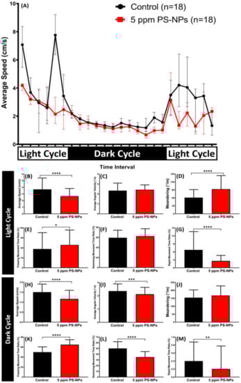The circadian rhythm locomotion activity assay for control and 5 ppm polystyrene nanoplastics (PS-NPs)-exposed zebrafish groups after a seven-week exposure. (A) Comparison of the time chronology changes of the average speed between the control and the PS-NPs-exposed fish in light and dark cycles. The white area shows the light period and the black area shows the dark period. Comparison of the average speed (B,H), average angular velocity (C,I), and meandering (D,J), freezing movement time ratio (E,K), swimming movement time ratio (F,L), and rapid movement ratio (G,M) during the light and dark cycles, respectively. The data are expressed as the median with interquartile range and were analyzed by Mann–Whitney test (n = 18 for control; n = 18 for PS-NPs-exposed fish; * p < 0.05, ** p < 0.01, *** p < 0.001, ****, p < 0.0001).