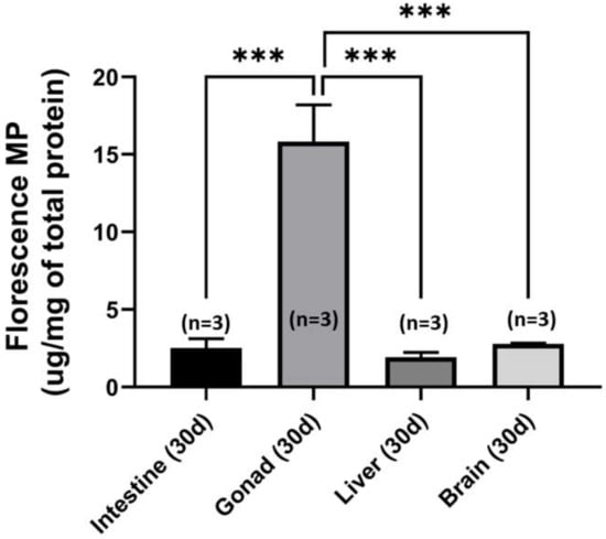 Comparison of the tissue distribution of green fluorescence-labeled nanoplastics among different tissues in zebrafish after ~30 days of polystyrene nanoplastics (PS-NPs) exposure. The data are expressed as the mean ± SEM and they were analyzed by One-way ANOVA, which continued with post hoc analysis (n = 3; *** p < 0.001).