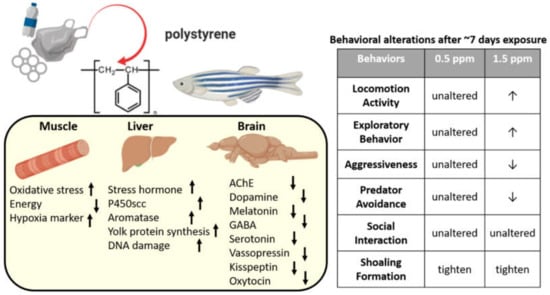 Schematic diagram of the biochemical and behavioral changes after polystyrene nanoplastics (PS-NPs) exposure in zebrafish. Left panel showing the biomarker expression alteration (↑: up regulated, ↓: down regulated) in the muscle, liver, and brain after PS-NPs exposure. Right panel showing the behavioral alteration after PS-NPs exposure at either 0.5 or 1.5 ppm (↑: higher behavior level, ↓: lower behavior level).