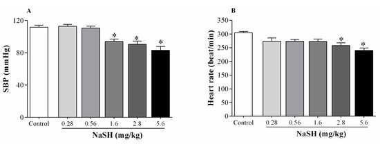 Dose-dependent effects of NaSH on systolic blood pressure (SBP) (A) and heart rate (B). Values are mean ± SEM (n = 6/group); * p < 0.05 compared to non-treated control rats.