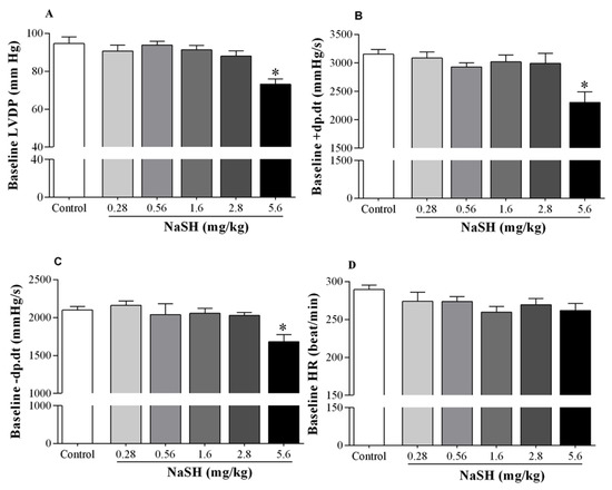 During the stabilization period, NaSH at 5.6 mg/kg decreased left ventricular developed pressure (LVDP) from 94.7 ± 3.5 to 73.2 ± 2.7 mmHg (p = 0.0001) (Figure 2A), peak rate of positive changes in left ventricular pressure (+dp/dt) from 3153 ± 84 to 2307 ± 185 (p = 0.0012) (Figure 2B), and peak rate of negative changes in left ventricular pressure (−dp/dt) from 2099 ± 50 to 1682 ± 93 (p = 0.0180) (Figure 2C). At all doses tested, NaSH had no effects on baseline heart rates (Figure 2D).