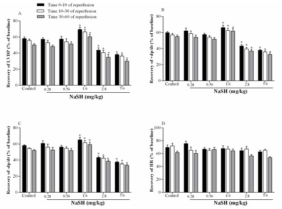Effects of different doses of NaSH on hemodynamic parameters during the recovery period. Hemodynamic parameters included left ventricular developed pressure (LVDP, A); peak rate of positive changes in left ventricular pressure (+dp/dt, B); peak rate of negative changes in left ventricular pressure (−dp/dt, C) and heart rate (HR, D). Values are mean ± SEM (n = 6/group); * p < 0.05 compared to non-treated control rats.