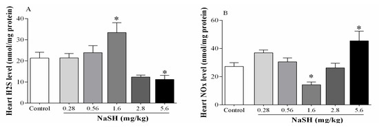 NOx levels decreased from 27.2 ± 2.7 to 14.2 ± 1.9 nmol/mg protein (p = 0.0906) at 1.6 mg/kg NaSH (Figure 5B), but NOx levels increased to 45.4 ± 6.9 nmol/mg protein (p = 0.0077) at 5.6 mg/kg NaSH, with no effect at any of the other doses, Figure 4B.
