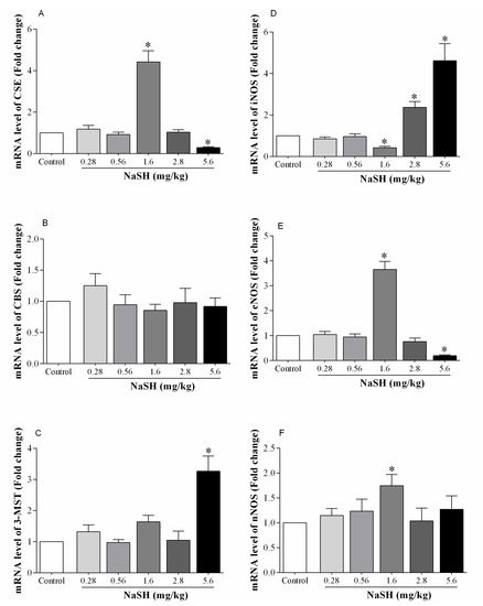 NaSH had no effect on mRNA expression of CBS at any of the doses employed (Figure 6B). The level of 3-MST mRNA was increased by 220% at 5.6 mg/kg NaSH with no effects at any of the other doses (Figure 6C).