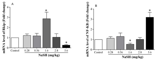 RKIP expression was increased by 187% (p = 0.0260) at a NaSH dose of 1.6 mg/kg, and it was decreased by 73% (p < 0.0001) at a dose of 5.6 mg/kg, Figure 7A. NaSH at a dose of 1.6 mg/kg decreased mRNA expression of NF-κB by 46% (p = 0.0018), whereas at 5.6 mg/kg it increased it by 219% (p < 0.0001), Figure 7B. Other doses of NaSH had no effect on RKIP or NF-κB expression.