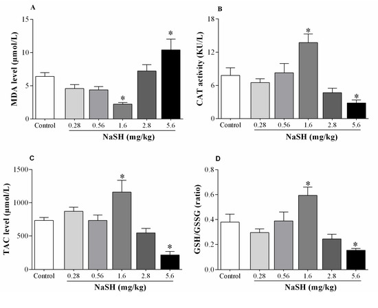 NaSH at 5.6 mg/kg increased MDA levels by 62% (p = 0.0437), Figure 8A; decreased CAT activity by 64% (p = 0.0938), Figure 8B; decreased TAC concentration by 71% (p = 0.0064), Figure 8C; and decreased GSH/GSSG ratio by 59% (p = 0.0690), Figure 8D. Other doses of NaSH had no effects on any of these parameters.