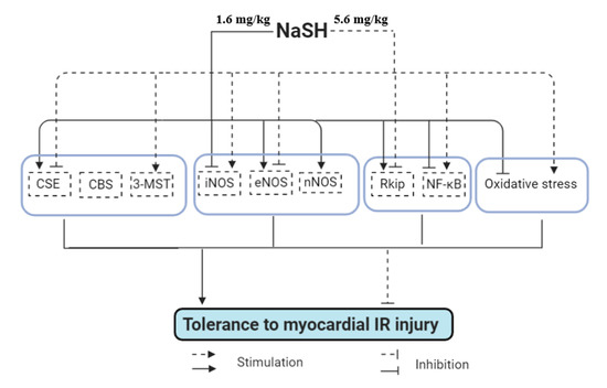 As illustrated in Figure 10, NaSH exhibited biphasic effects in our study, i.e., low dose had no effect, intermediate dose had a protective effect, whereas a high dose exacerbated myocardial IR injury. Higher tolerance to IR injury in hearts isolated from rats treated with intermediate dose of NaSH, at least in part, was associated with higher CSE-derived H2S and lower iNOS-derived NO as well as lower oxidative stress in the heart tissue after IR. In addition, the beneficial effects of H2S was accompanied with a decrease in NF-κB expression and increase in RKIP expression. NaSH at a high dose (5.6 mg/kg) had the opposite effects.