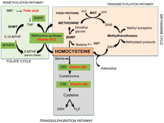 Additionally, various polymorphisms of the genes coding for MS, MTHFR, and CBS causing the low or absent activity rates of these proteins involved in Hcy clearance have an effect on circulating Hcy levels [44,45,46,47]. Kluijtmans et al. [47] reported at least five common functional polymorphisms that impair the activity of enzymes involved Hcy metabolism, including methylenetetrahydrofolate reductase [MTHFR] 677C>T and 1298A>C, methionine synthase 2756A>G, cystathionine β-synthase [CBS] 844ins68, and methionine synthase reductase 66A>G. These genetic variations affecting Hcy concentrations seem to be more significant in early-life than middle-aged subjects; it is possible that control of dietary factors would reduce homocysteine levels.