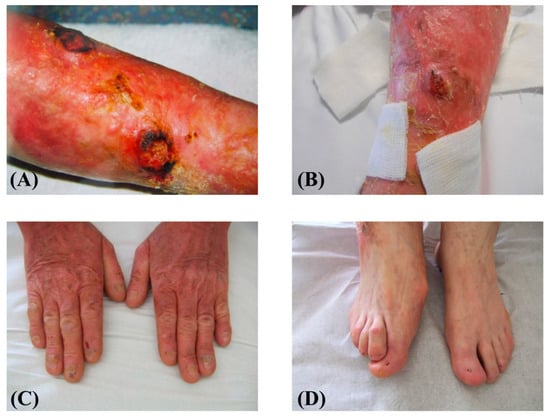 Patient clinical features. (A) The skin of the left leg is diffusely erythematous with several blisters, crusts, and two nodular lesions with hyperkeratotic borders, suggestive for squamous cell carcinoma (SCC), and (B) the right leg skin shows similar features and a single nodular lesion, also suggestive of SCC; the three nodular lesions were excised and the diagnosis confirmed by histopathology. (C) Skin atrophy, dyspigmentation and a few small crusts of the digits and hand dorsum. The fingernails are markedly dystrophic or absent; (D) absence of toenails.