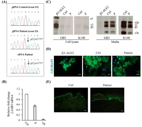 Sanger sequencing of the JEB-GI genes identified two heterozygous mutations in LAMB3: c.1903C>T (exon 14) (Figure A1) and c.3513C>A (exon 23) (NCBI GenBank NM_000228) (Figure 2A). The former variation is recurrent in European JEB individuals and results in p.Arg635* premature termination leading to mRNA decay []. The latter variant results in the p.Cys1171* change of the penultimate codon of the β3 chain. This mutation is not reported in the literature, but it is annotated in the gnomAD exome variant database at the heterozygous state (2 alleles out of 246,146, MAF: < 0.01). At mRNA level this mutation has likely no impact on mRNA stability being located in the last LAMB3 exon. Indeed, real-time reverse transcriptase-PCR of total RNA extracted from patient cultured keratinocytes revealed LAMB3 mRNA levels reduced by about 50% in comparison to normal cells (Figure 2B). In addition, direct sequencing of a cDNA fragment spanning the c.3513C>A mutation site showed that all LAMB3 transcripts produced by the cells carried this variant, thus demonstrating that the nonsense mRNA decay mechanism targeted the 50% of transcripts linked to the p.Arg635* while sparing the other 50% linked to the p.Cys1171* mutation (Figure 2A, lower panel). In agreement with mRNA levels, immunoprecipitation (IP) and SDS-PAGE analysis of cultured keratinocyte lysate using the same mAbs did not detect accumulation of mutant LM332 (precursor chains: 200 kDa for α3, 155 kDa for γ2, and 140 kDa for β3) within patient cells while protein cellular accumulation was evident in keratinocytes of a patient with a previously characterized mutation causing unfolding of the LE motif 2 of the β3 short arm (β3-ΔLE2) (Figure 2C) []. Consistently, spent culture medium of cultured patient cells showed bands for mature, physiologically cleaved, LM332 (165 kDa for α3 and 105 kDa for γ2), the intensity of which was estimated to be about 60% of control keratinocytes (Figure 2C). Immunofluorescence (IF) analysis of patient keratinocytes revealed a staining intensity for secreted heterotrimeric LM332 (GB3 staining) substantially similar to control cells without evidence of intracytoplasmic accumulation, which, in contrast, marked the β3-ΔLE2 cells (Figure 2D). Finally, IF examination of a perilesional skin biopsy with mAb GB3 showed a positive signal, which appeared comparable to control skin (Figure 2E). Taken together, these findings demonstrate that the patient is a functional hemizygous for the c.3513C>A: p.Cys1171* nonsense mutation. This change eliminates the last two amino acids of the β3 subunit (Cys1171-Lys1172), one of which is the cysteine residue involved in the disulphide bond between the β3 and γ2 chains at the C-terminus []. Lack of this bond does not influence LM332 chain assembly and secretion, as no intracytoplasmic protein retention was detected in patient skin and cultured keratinocytes.