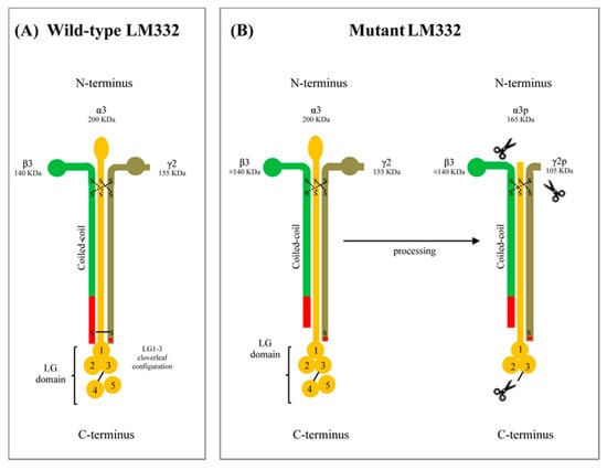 Loss of LM332 causes junctional epidermolysis bullosa (JEB), a spectrum of clinical phenotypes characterized by fragility of the skin and mucous membranes, blisters, and erosions that occur in response to minor frictional forces []. The severity of skin fragility and phenotype largely depends on the amount of LM332 produced by mutant keratinocytes, which bear recessive mutations in any of the three genes, LAMA3A, LAMB3, LAMC2 encoding the α3a, β3, and γ2 chains, respectively. The early lethal JEB generalized severe subtype results from absent LM332, while generalized intermediate (JEB-GI) or localized JEB forms associate with variably reduced LM332 amounts. In addition, JEB-related non-blistering conditions with specific tissue manifestations result from dominant haploinsufficiency or from partial loss-of-function that spares the amount and coiled coil domain of the heterotrimer [,,,]. JEB-GI can also be due to genetic defects in COL17A1 encoding collagen XVII [].
