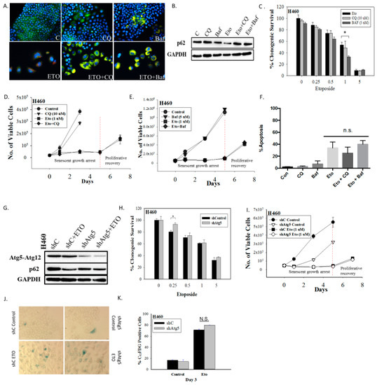 Autophagy has historically been considered a survival response under conditions of nutrient deprivation or hypoxia as well as a process that facilitates tumor growth and serves as a mechanism of resistance to therapy [26,27,28,29]. Consequently, we hypothesized that autophagy could serve to maintain metabolic homeostasis in the senescent tumor cells and might thereby be necessary for maintenance of the senescent state. To determine the potential involvement of etoposide-induced autophagy in maintaining senescence in the H460 cells, autophagy was suppressed using both pharmacological and genetic strategies applied early and followed by exposure to etoposide. The impact on cell viability was then monitored. H460 cells were pretreated for 3 hours with the autophagy inhibitors chloroquine (CQ, 10 µM) or bafilomycin A1 (Baf, 5 nM) followed by 24 hours of exposure to etoposide in the presence of the CQ or Baf. Exposure of H460 cells to the lysosomotropic agents CQ and Baf resulted in failure of lysosomal acidification [30,31], which is reflected by the yellow staining of vacuoles by acridine orange (Figure 2A); autophagy inhibition was confirmed by decreased degradation of p62/SQSTM1 in the presence of CQ or Baf in etoposide-treated cells (Figure 2B). The minimal effect of CQ and Baf on p62/SQSTM1 levels in etoposide-untreated cells is likely reflective of low basal levels of autophagy.