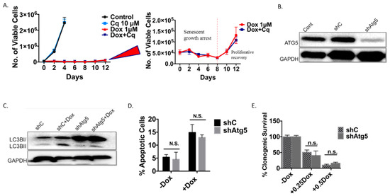 As was the case with the H460 cells induced into autophagy/senescence by etoposide, the autophagy induced by Dox in the 4T1 cells was also shown to be non-protective. Silencing of Atg5 (Figure 4B,C) did not lead to increased apoptosis (Figure 4D), did not result in decreased cell survival based on colony formation (Figure 4E), and did not compromise the induction of senescence (Figure 4F,G). Cells were also induced into a prolonged growth arrest followed by proliferative recovery after 10 days independent of the Atg5 status of the cells (Figure 4H and expanded adjoining figure).