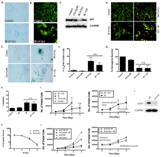 The induction of senescence and autophagy in HCT116 cells in response to radiation. (A) SA- β-galactosidase staining of HCT116 cells treated with 4 Gy radiation demonstrating induction of senescence (20x objective). (B) Fluorescent microscopy images of acridine orange staining 48 hours post-radiation (4 Gy). Increased acidic vesicle formation is visualized (20x objective). C-G. Cells were pre-treated with CQ (5 µM) 3 h prior to radiation (4 Gy) exposure. Media was replenished 24 h post-treatment. (C) Western blot analysis demonstrating autophagy blockade via p62 accumulation in cells pre-treated with CQ. (D) Acridine orange staining indicating blockade of lysosomal fusion in cells pre-treated with CQ (20x objective). (E) SA-β-galactosidase staining demonstrating increased SA-β-galactosidase activity in both cells exposed to radiation alone or pre-treated with CQ prior to radiation (20x objective). (F) SA-β-galactosidase activity was monitored by measuring C12FDG staining using flow cytometry. (G) Clonogenic survival assay showing radiation-induced growth inhibition in cells exposed to radiation (4 Gy) alone and in combination with CQ (5 µM). (H) Annexin 5/PI staining was used to assess apoptosis 48 h post-radiation [radiation (4 Gy) alone or with CQ (5 µM) pre-treatment]. Autophagy blockade did not alter radiation-induced apoptosis (n = 2). (I) Cells were treated with 4 Gy radiation alone or with CQ pre-treatment, and viable cell number was assessed via trypan blue exclusion on the indicated days. The adjoining figure shows the expanded scale for the lower portion of the graph. (J) Western blot demonstrating ATG5 knockdown. Autophagy blockade by shATG5 in the HCT-116 cells was established in our previous report [17]. (K) Clonogenic survival demonstrating dose-dependent reduction in both shControl and shATG5 knockdown cells. (L) Viable cell number was assessed in shControl and shATG5 HCT116 cells exposed to 4 Gy radiation. Representative curves of three independent studies are shown (n = 3). Results presented were from three independent experiments, unless otherwise indicated; n.s. represents no significant difference compared to radiation alone.