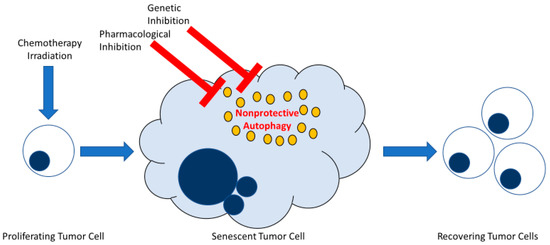 While autophagy might have been anticipated to contribute to the maintenance of the metabolic integrity of the senescent tumor cells, early inhibition of autophagy induced following stress exposure did not appear to affect senescent cell survival. Furthermore, inhibition of autophagy, prior to and during drug or radiation exposure failed to prevent the tumor cell population from recovering and resuming growth. Consequently, while autophagy may potentially represent an intrinsic component of the senescent response elicited by cancer therapy, this current study indicates that autophagy plays a minor, if any, role in facilitating proliferative recovery in this system or interfering with the fate of senescent cells. The ability to reach this conclusion was facilitated by the fact that the autophagy was non-protective in function in all three experimental models, as illustrated in Figure 6 [23,41].
