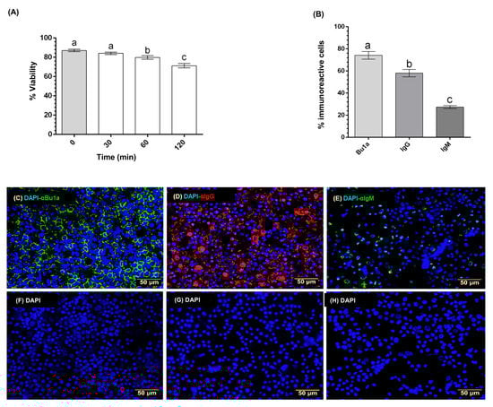 Characterization of bursal B-lymphocyte (BBL) cultures. Cell viability of BBLs was determined by the trypan blue exclusion method over 120 min. (A). Each bar represents mean ± SEM, n = 3. Groups with different letters are significantly different (p < 0.0001) by using one-way ANOVA and Dunnett´s post-hoc test. Cell subpopulations were characterized by ICC using primary antibodies to detect whole B cells (α-Bu1a) (C), mature B cells (α-IgG) (D), and immature B-cells (α-IgM) (E). DAPI staining was used to detect cell nuclei. Negative controls were prepared in the absence of primary antibodies (F–H). The proportion of BBLs subpopulations was calculated dividing the number of immunoreactive cells to each antibody between total number of DAPI reactive cells (B). Each bar represents mean ± SEM, n = 3. Groups with different letters are significantly different (p < 0.001) by using one-way ANOVA and Dunnett´s post-hoc test.