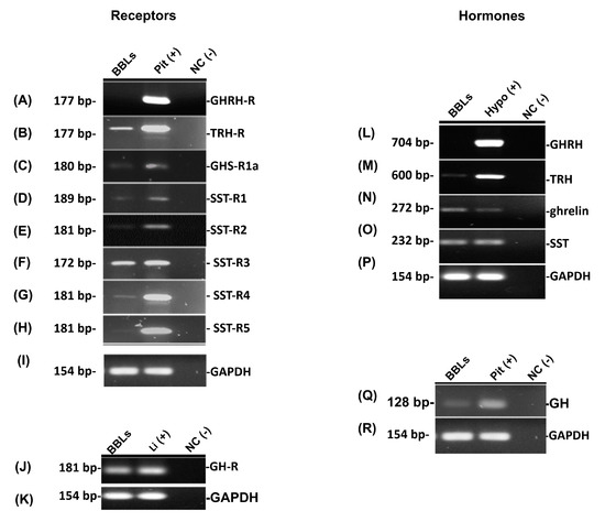 Expression of growth hormone-releasing hormone (GHRH) (L) and its receptor, GHRH-R (A), thyrotropin-releasing hormone (TRH) (M) and TRH-R (B), ghrelin (N) and GHS-R1a (C), SST (O) and SST-R(1-5) (D–H), GH (Q) and GH-R (J) mRNAs were evaluated in BBLs by RT-PCR and electrophoresis in agarose gels. Pituitary (Pit +), hypothalamus (Hypo +) and liver (Li +) were used as positive controls. GAPDH was used as reference gene in all cases (I,K,R). Base pair (bp). Negative controls (in the absence of the corresponding specific template) were included in all cases. Representative figure of 3 independent experiments.