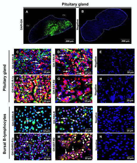 Subsequently, we analyzed the presence and co-localization of GH with TRH-R, GHS-R1a, GHRH-R, and SST-R2 in BBLs cultures and in the chicken pituitary by immunocytochemistry. As expected, all of these receptors and GH were present in the control pituitary sections. Additionally, we found that GH-IR co-localized with TRH-R, GHRS-R1a, and SST-R2 immunoreactivities in BBL cultures. Interestingly, in these cells, TRH-R-IR was predominantly associated to the cell nuclei, whereas GH-IR was present in the cytoplasm; instead, GHRS-R1a and SST-R2 immunoreactivities were mostly located in the cytoplasm and near the membrane, where they co-localized with GH. No GHRH-R-IR was observed in BBLs, in accordance with the lack of GHRH-R mRNA expression. It has been described that these receptors are expressed in the immune system of other vertebrate groups, for example, in fish, rat, and humans, where the expression of TRH-R has been observed in thymus, bone marrow, lymph nodes, and spleen extracts [26,44,45,46]. The presence of TRH-R in other tissues besides the pituitary suggests other non-canonical actions and possibly a cross-talk between the immune and the neuroendocrine system [26].