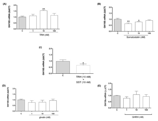 TRH, ghrelin, GHRH, and somatostatin (SST) effects upon GH mRNA expression in BBLs. After one-hour treatment with 1, 10 and 100 nM of either TRH (A), SST (B), ghrelin (D), GHRH (E), or the combination of 10 nM of both TRH and SST (C), the relative GH mRNA expression was determined by qPCR and corrected by the threshold cycle (CT) using the formula 2−ΔΔCT [29,30]. Ribosomal 18S RNA was used as reference gene. Each bar represents mean ± SEM. Data were obtained from three independent experiments analyzed by duplicate. Asterisks indicate significant differences compared with control groups (* p < 0.05; ** p < 0.01), by using one-way ANOVA for multiple comparisons and Šidák as post-hoc test. A paired t test was used to evaluate the effect of TRH in combination with SST (* p < 0.05).